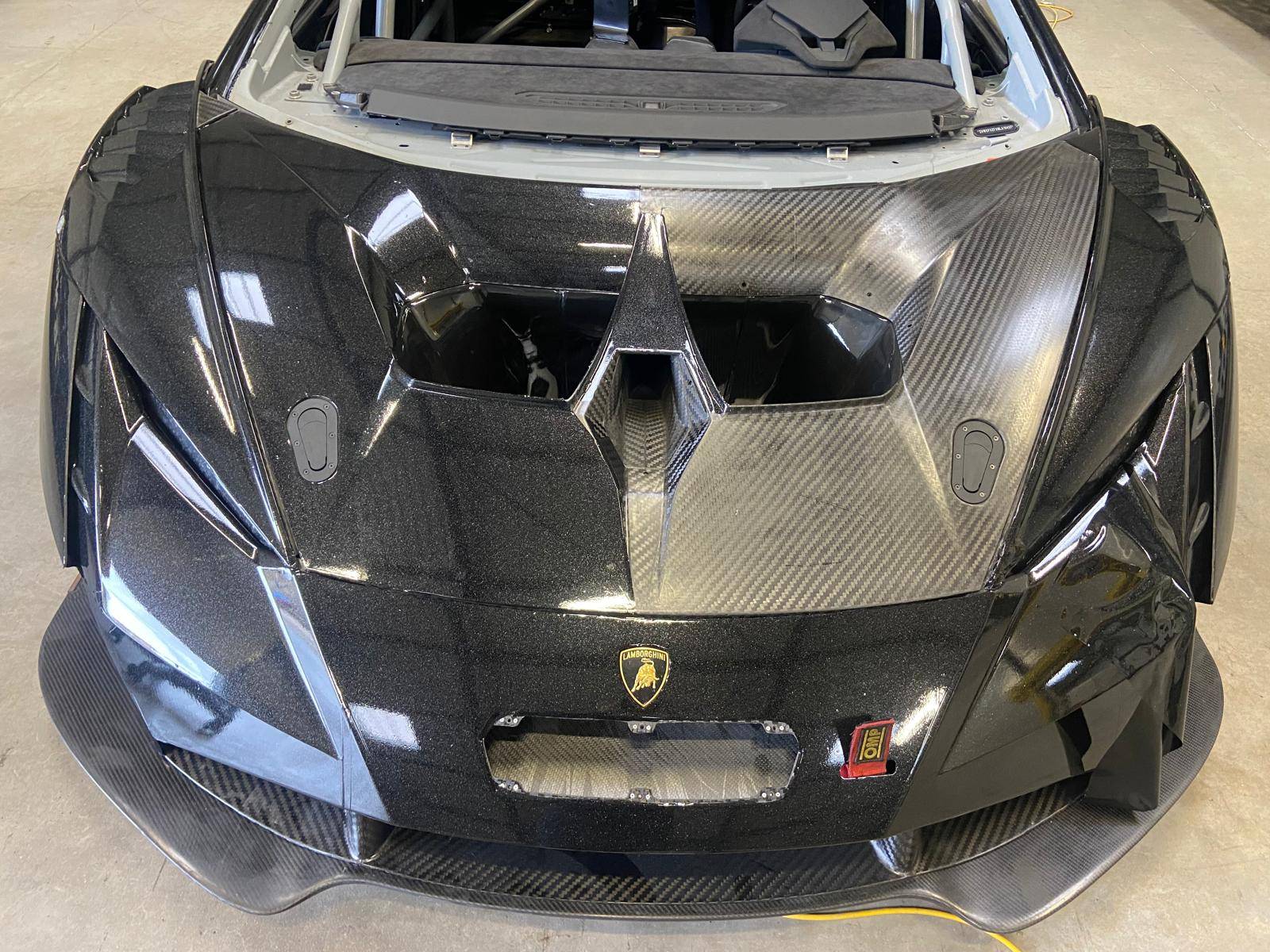 La Lamborghini est de base toute en carbone, nous avons dû la recouvrir d’un covering de la marque Hexis le Noir EbènePailleté Brillant ainsi que d’un kit déco or également de la marque Hexis.